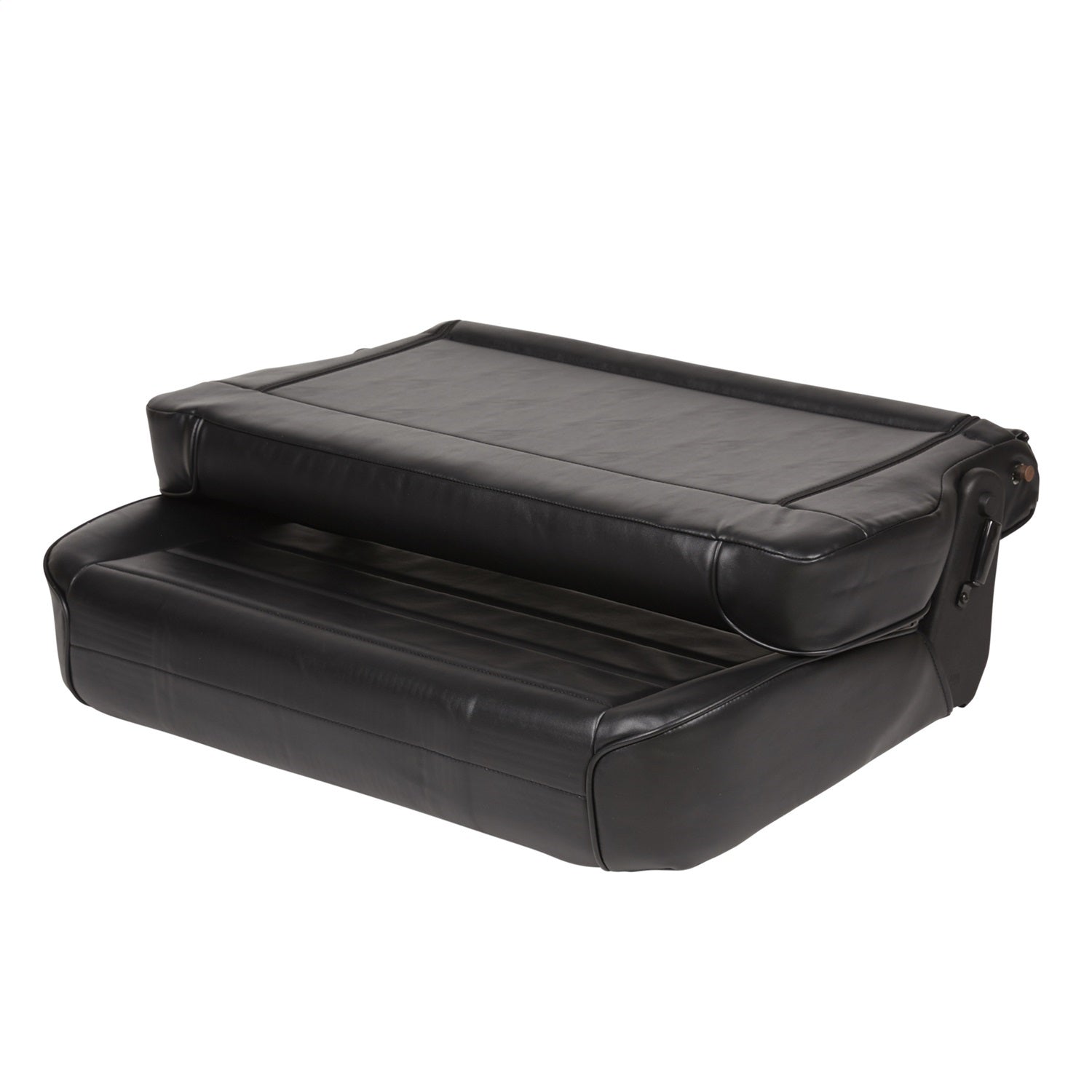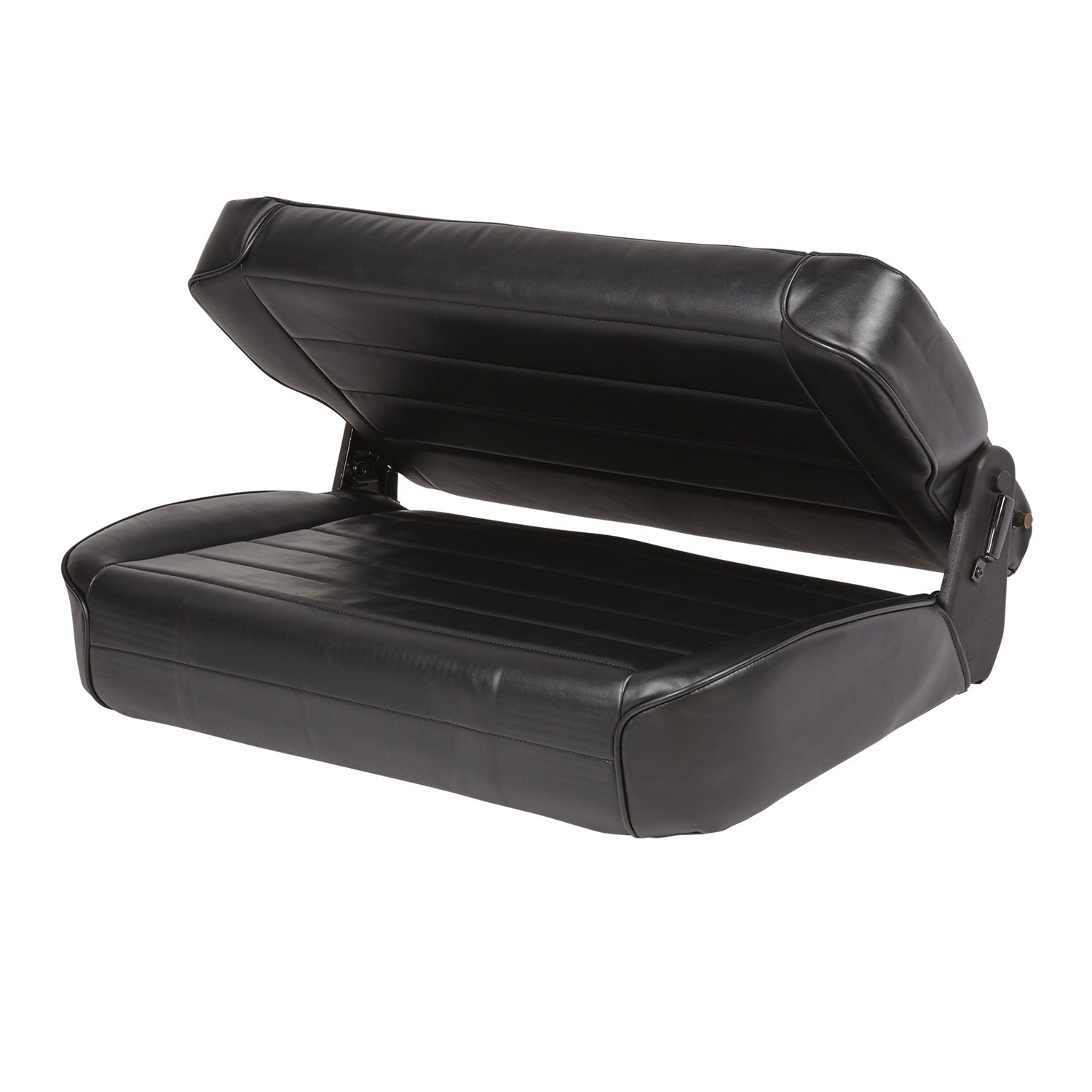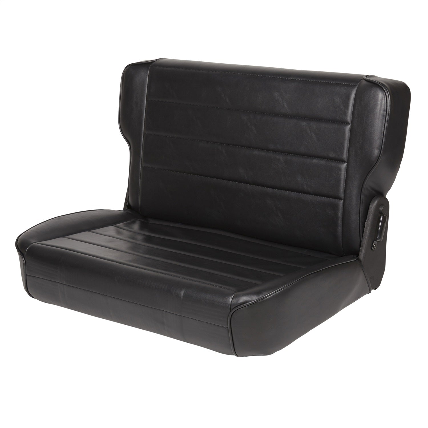 When cargo space is needed, just fold & tumble the seat forward and store it out of the way behind your front seats. Installs easily with minimal drilling. This rear seat is available in plush vinyl or full fabric front covering. This fold & tumble seat matches the factory style replacement seat pattern. Image shown for illustration purposes only.