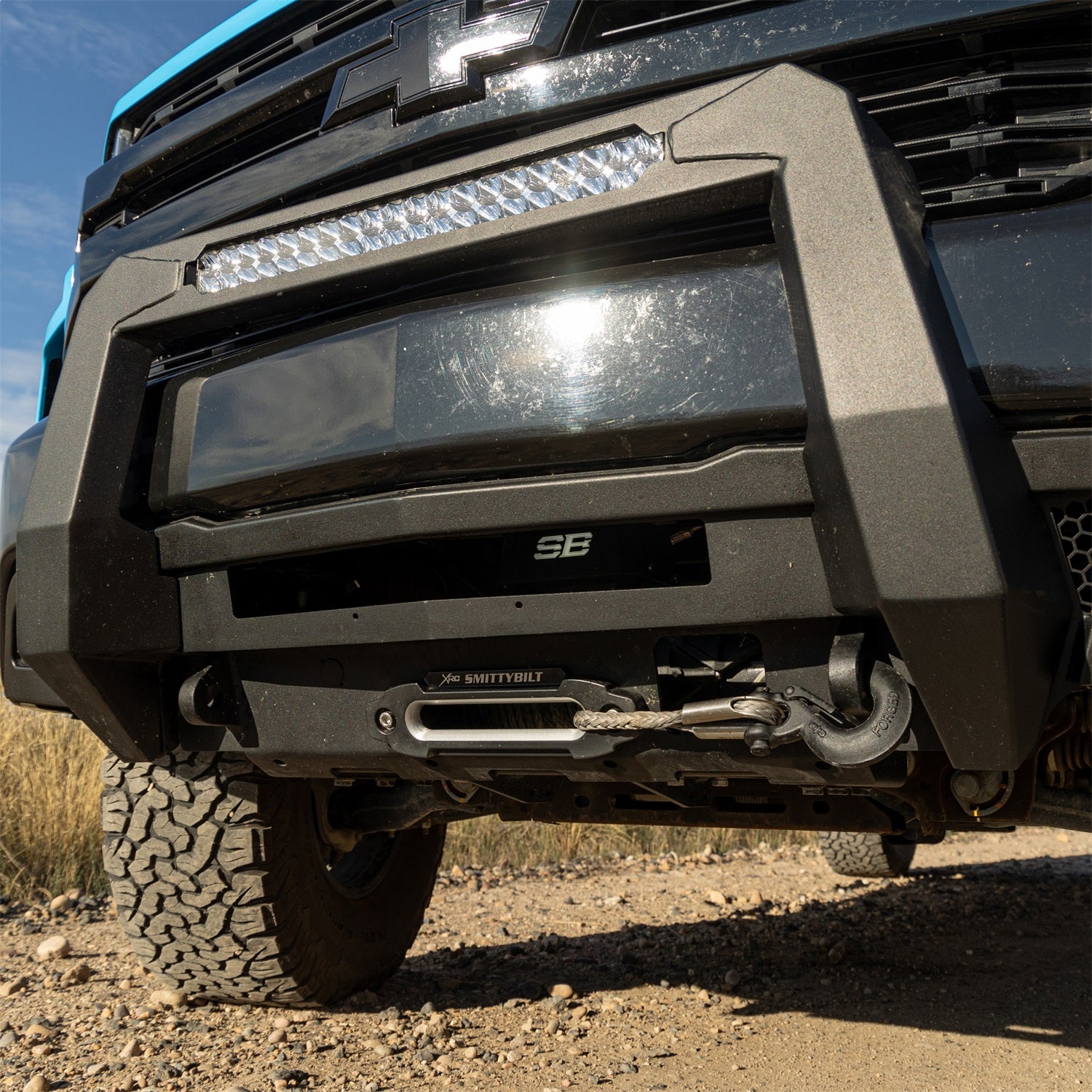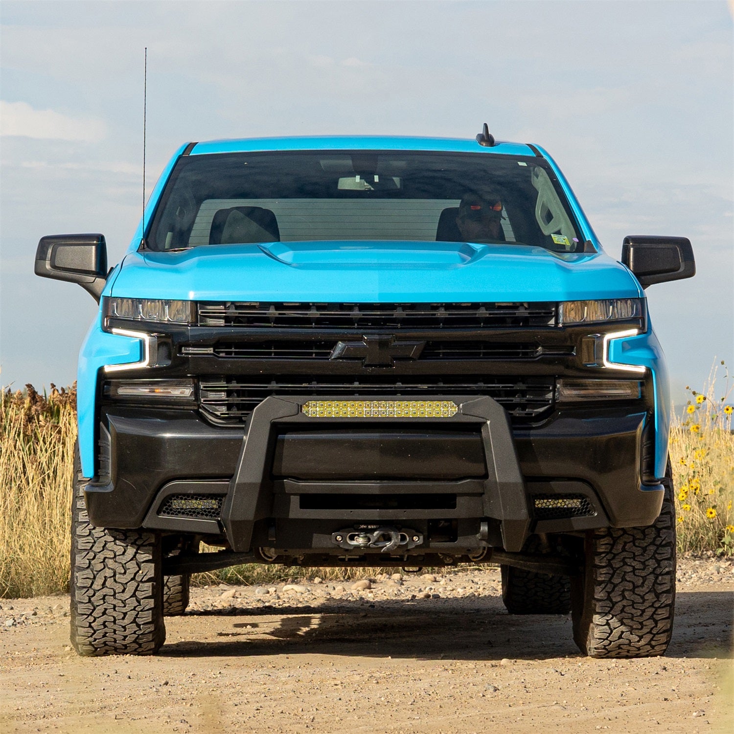 Looking to upgrade your vehicles factory appearance with a modern, sleek look? The Orion Bumper offers heavy-duty, front-end protection without the extra bulk. This form-fitting bumper will complement the look of your Chevy(R) and is designed to provide your truck with added utility. Two reinforced D-ring mounts alongside the optional winch mount tray fits most standard size winches up to 12,000lbs. This system allows you to mount up to two 6" lights behind each side panel and one 20" light bar in the center of the bumper for increased visibility in low light situations. Constructed from quality cold-roll steel and finished with a black powder coat.