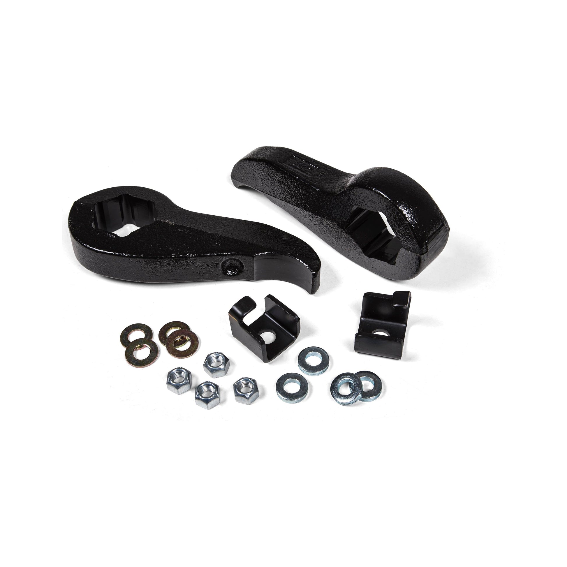 A pair of cast iron torsion bar keys are at the heart of this 2" leveling kit that delivers a leveled stance, comfortable ride and handling and clearance for up to 35" tires. Specially engineered to allow re-use of factory shocks with the supplied upper shock extensions, this kit provides more suspension travel without inducing worry of overextending at full droop.