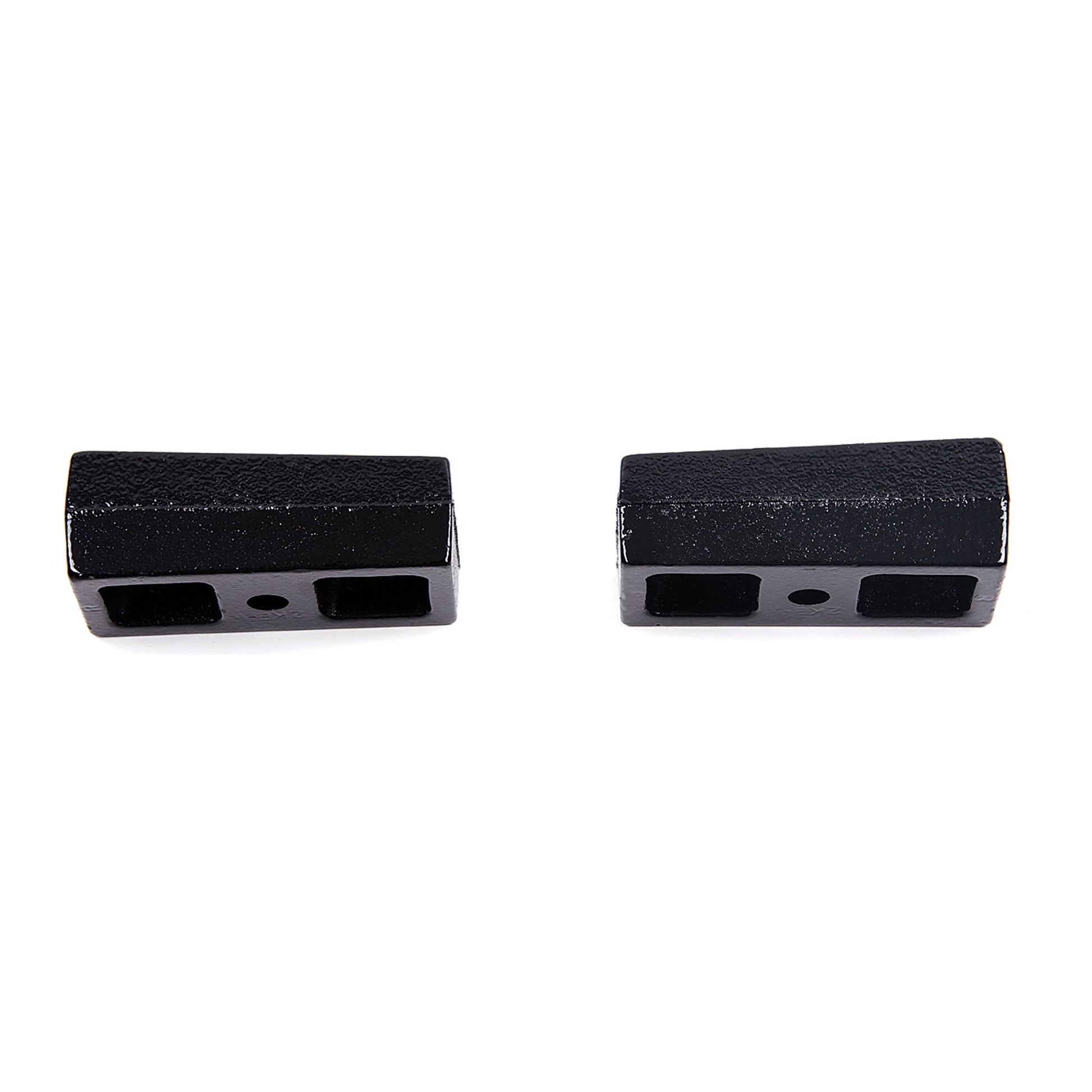 These high quality 2" cast iron lift blocks are specially designed to lift the rear of leaf spring trucks. They come finished in a black e-coating and use a tapered design to help improve pinion angle once installed. Uses 5/8" pin size. Sold in pairs.