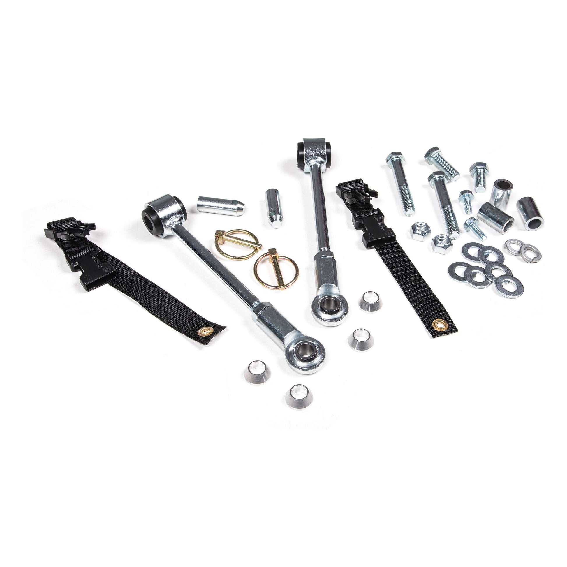 Take performance to the next level with a set of these sway bar disconnects. Designed to allow you to quickly and easily disconnect the front sway bar to allow for increased front suspension travel and articulation. High strength construction and an adjustable design allows to correct sway bar operating angle at a range of lift heights. A quick pull of the pin allows these to be disconnected and secured up out of the way with the supplied lanyard until its time to reconnect and hit the road. Designed for use with 2-5" lift kits.